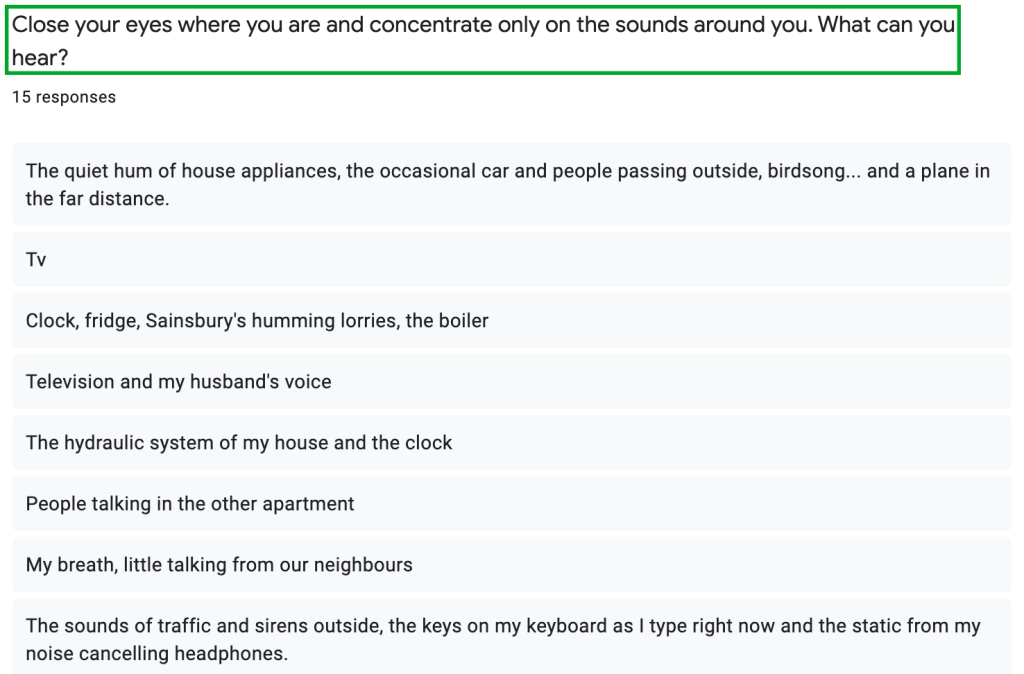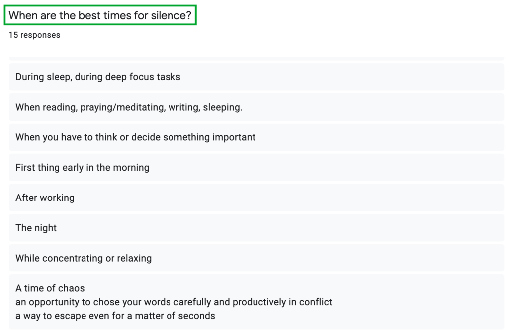 As a part of this manifesto, I wanted to understand what other people thought about silence. To do this, I created an online survey with multiple questions and a test (which involved staying in silence for 5 minutes).