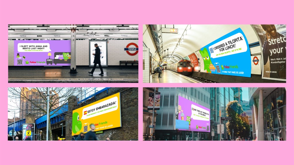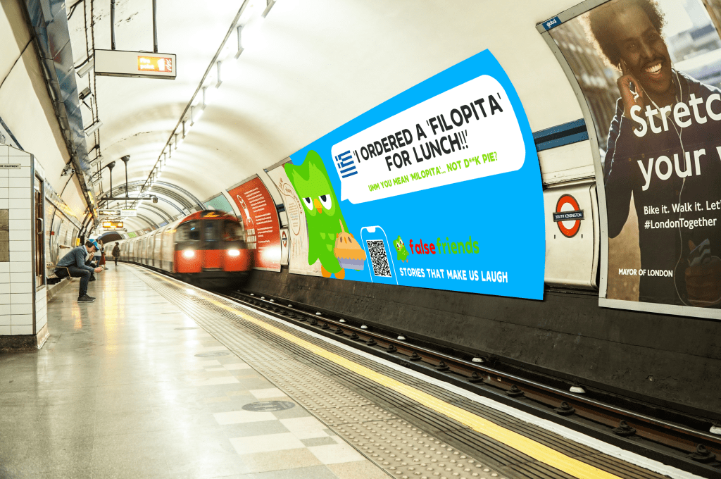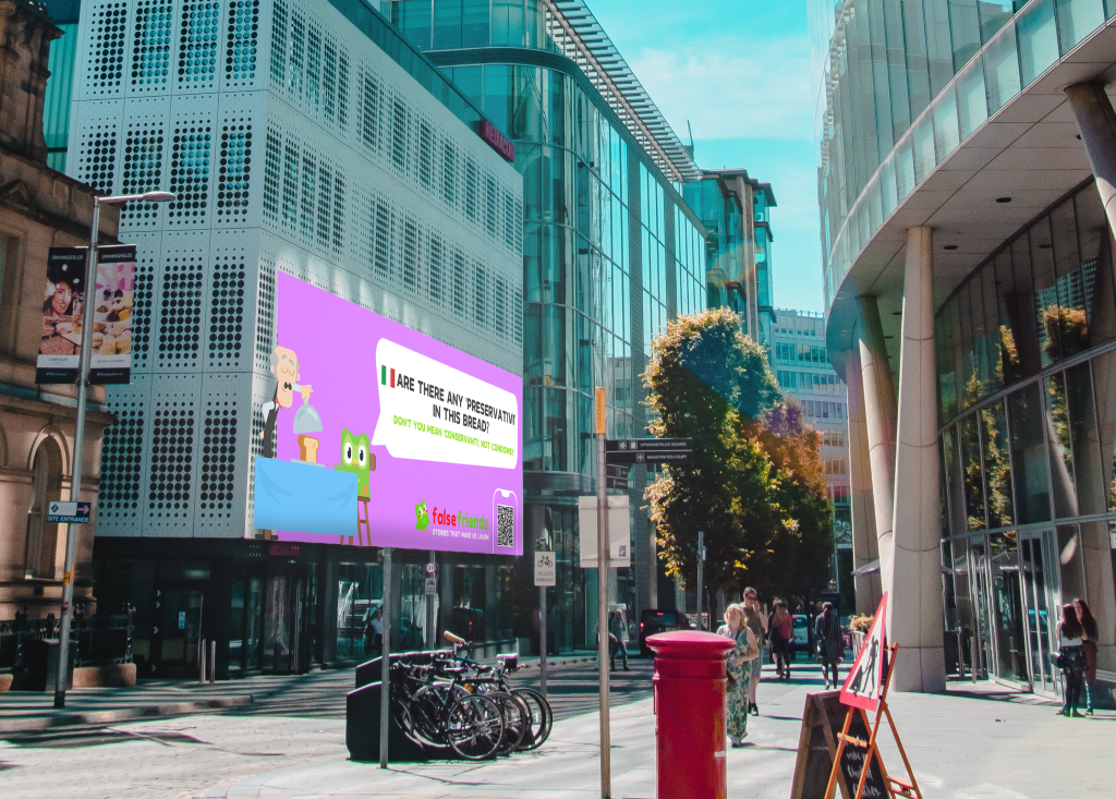 I created the 4 OOH visuals for this project advertising funny language mistakes in different languages. Each banner has an english response in order to make the jokes more understandable for the audience. The colours fit the campaigns main visual identity, the font is ‘Duolingo’. The QR code would direct audience to the campaign page and social account. Three of the ideas were made into animations by my partner, and the 4th ‘Filopita’ was left as an example. We originally confirmed on having three OOH visuals, however at last minute my partner suggested I create a fourth so the campaign would have fitted together better. In the end, the visuals looked great in their city environments, bringing colour and vibrancy to their surroundings. The final outcomes are presented below.