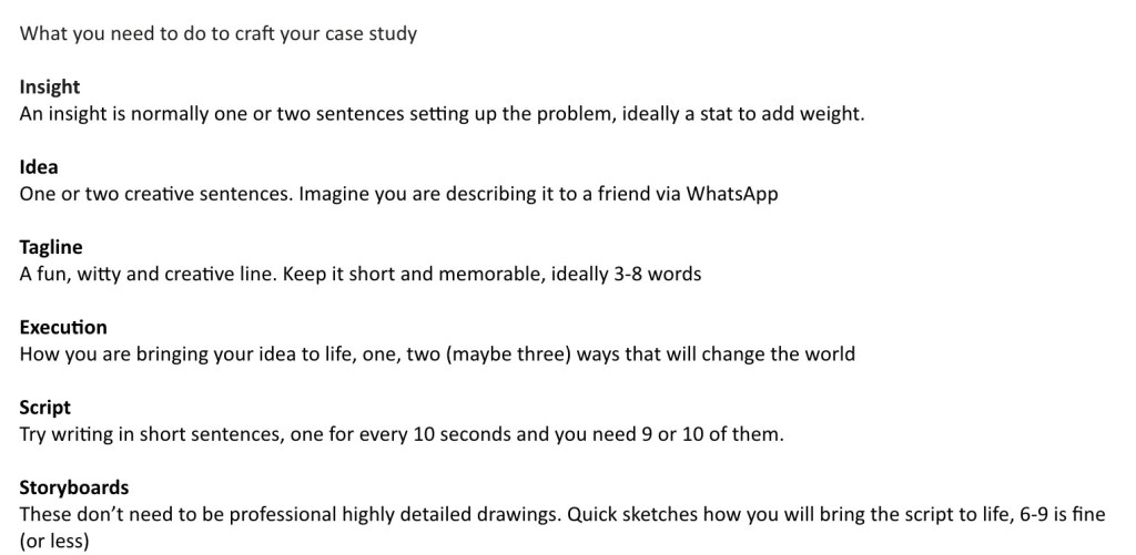 A lecturer gave us a useful list of points to craft our case-study around including the insight, idea, tagline, execution, script and storyboard. To understand these points better, I wrote down my ideas on how to tackle the project and organise the process. My partner and I had a further meeting where we discussed our ideas and thoughts on the over all structure of the study.