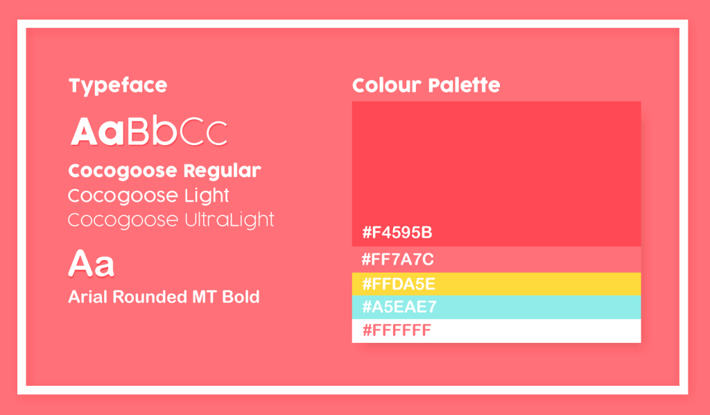 The chosen typeface was Cocogoose and Arial Rounded MT Bold, as they are easily legible and give personality to the text. To the right you can see different fonts that were considered but not chosen as they were either too off-brand or cluttered the overall image/ packaging.