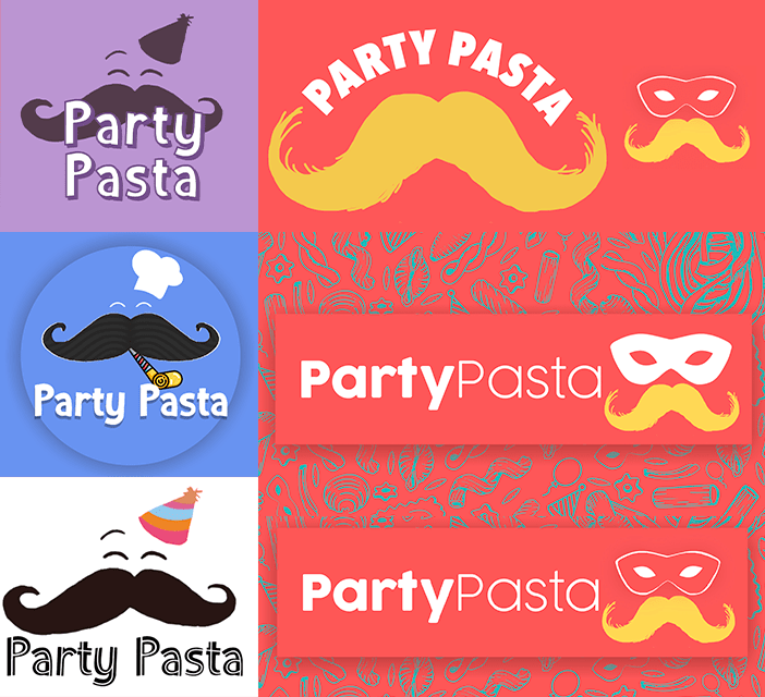 Now there was the matter of putting all of these ideas into one visual without over complicating the message. At a certain point, the moustache was over-bearing and it seemed to come the central focus over the title which was not wanted. After lots of experimentation on Photoshop and with pen and paper, the final logo was realised and I am happy with the outcome. Below you will see the final logo with the stylised background, giving a true sense of the Party Pasta branding.
