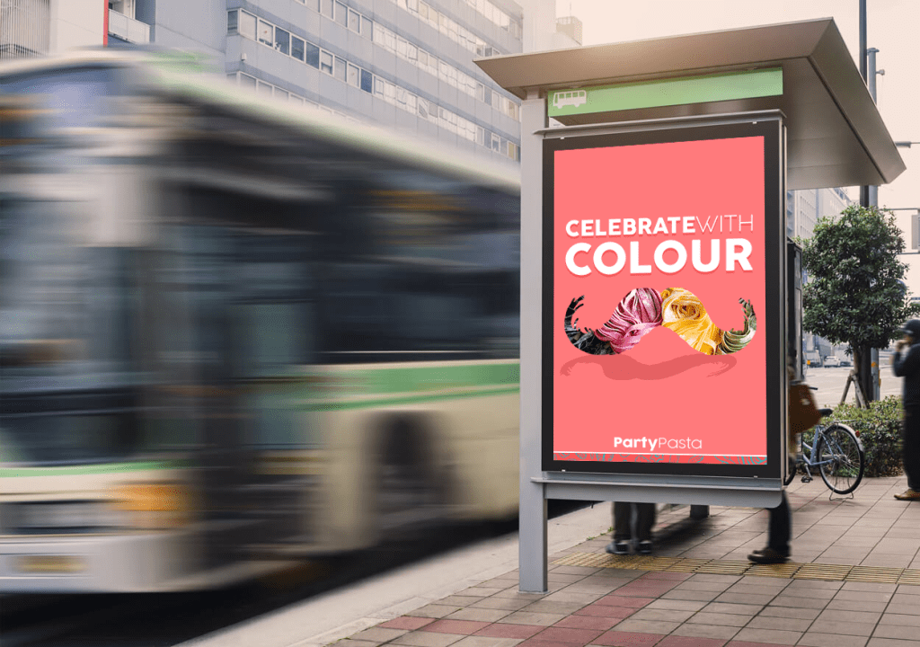 The OOH visuals were created on Photoshop and clearly represent the visual identity of Party Pasta while advertising the moustache shape of the logo and the tagline. These banners would be shown across London, and would catch the attention of passers-by with their bright colours and inspiring message.