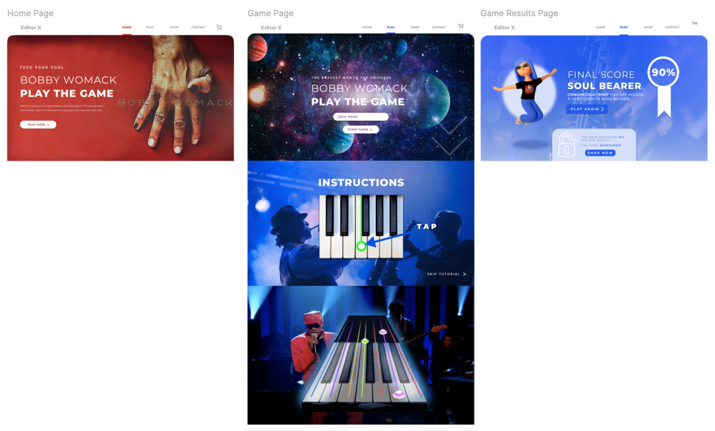 The strongest idea was to have a website homepage which had an interactive musical instrument to greet the viewer with the option to play a Guitar-hero style game. The music and theme would all be linked to Womack’s album, this way the viewer could interact and connect with his music by being involved with the entertainment. This game would be accessible across all devices and could eventually be used across other webpages D&AD want to create for the Editor X artists.
