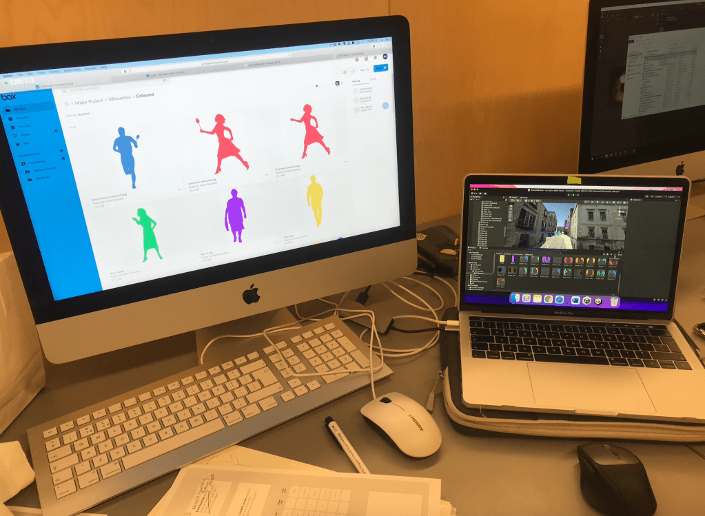 This week I worked on making the silhouettes visible within the scenes. I worked on the positions of the silhouettes the previous week and edited, vectorised and inserted the coloured versions on-top of invisible flat objects. Having these vibrant colours gave a new level to the project. I also had to add and change characters colours throughout this process.